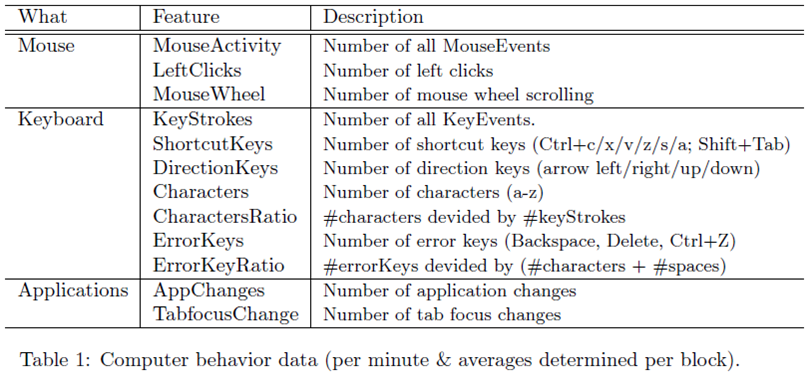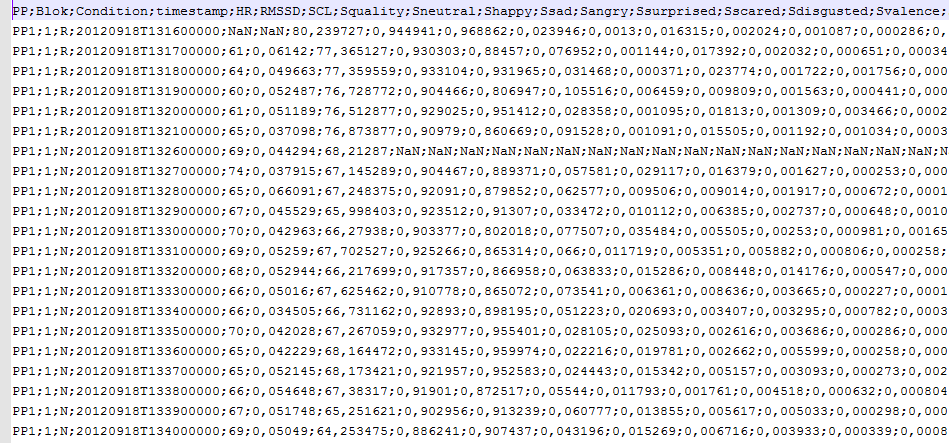 From all sensors, data was preprocessed and features per minute were determined. In the Feature dataset you find data of all 25 participants, annotated with the condition under which they worked.Sample data