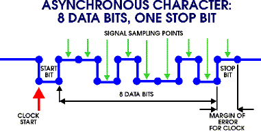 The stuffing methods were also connected to clock issues: how long is a bit? Character stuffing was used on simple serial lines with asynchronous communication. Each character consists of a start bit, 8 data bits and a stop bit. Even if the clocks of the sender and receiver differ by as much as 5%, the incoming character can be correctly sampled. |