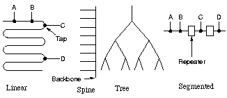 With spine and tree topologies, the junctions must contains boxes to match the impedance. But often repeaters are used, which receive, amplify and retransmit signals in both directions. Repeaters must be used if the maximum segment length is reached. A system may contain multiple cable segments and repeaters but no 2 receivers may be more than 2.5 km apart or have more than 4 repeaters between them (repeaters add time delay). |