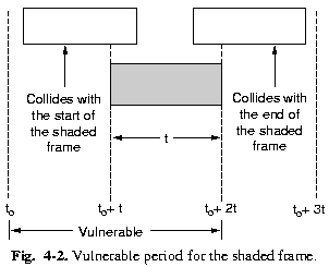 Let the "frame time" denote the amount of time to send the standard, fixed length frame. Assume that new frames are generated (by an infinite number of stations) according a Poisson pdf with mean S frames per frame time. Assume further that the pdf of transmissions (new frames and retransmissions) is also Poisson with mean G. Then S=GP0 with P0 the probability that a frame does not suffer a collision. Look at the shaded frame, if the other stations do not start sending a frame during its frame time and the previous frame time, there will be no collision. The probability that k frames are send in 2 frame times is: Pr[k] = ( (2G)k e-2G )/ k!. The probability of 0 frames, meaning no collision, is thus P0=e-2G. Thus S=Ge-2G |