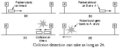 The length of the data field can be from 0 to 1500, but padding must be used to ensure a minimum frame length of 64 bytes. When B detects a collision, it aborts sending its frame and sends out a 48 bit noise burst. A must detect this before it is ready with sending, otherwise it thinks that its frame was sent correctly. |