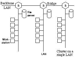 LAN's can be connected by bridges, which operate at the data link layer. There can be many reasons to use them. 1) many departments could have started to install their own LAN's and only later came the need to connect them. 2) an organization might be geographically spread over several buildings, a single LAN might then be more expensive than connecting several LAN's. 3) it may be necessary to split what is logically a single LAN into separate LAN's to accommodate the load (switches could be use for this purpose also). 4) for reliability reasons it might be needed to use separate LAN's so that a single failure somewhere does not bring down the whole system. 5) for security reasons it might be needed to isolate a part, containing sensitive information, so that it can not be reached from outside. |