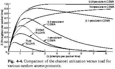 The maximum throughput S per frame time, occurs at G=0.5, giving S = 1/2e = 0.184, thus a channel utilization of only 18%. In slotted ALOHA, stations only transmit at the beginning of a slot, which has the length of a frame time. Thus if a station has something to send, it waits until the beginning of the next slot. A possibility to determine the beginning of slots, would be to have one special station which emits a short signal. The vulnerable period is now reduced to 1 frame time, thus S=Ge-G. The maximum throughput S is now 37%. |