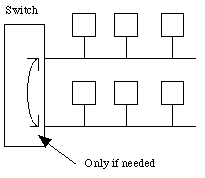 A switch can be used the reduce the number of stations competing to send. Its checks an incoming frame to see if it addresses a station on the other cable. If so, it makes the connection to the other cable, otherwise not. It introduces thus a delay of a bit more than 14 bytes. Other kind of switches store incoming frames, destinated to the other input port, in RAM before trying to send them to that port. Each cable then becomes a separate collision domain with 4 stations on it, instead of a single collision domain with 6 stations. The switch becomes more effective if the traffic between the domains is smaller than the traffic inside domains. |