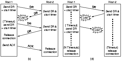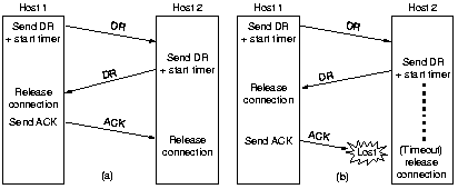 Asymmetric release is abrupt and may result in data loss, in case one site sends a disconnect request while data from the other side is still under way. Therefore usually symmetric release is used. A three-way handshake is usually used to release a connection. Timers must be used to handle the cases that TPDU's are lost. |