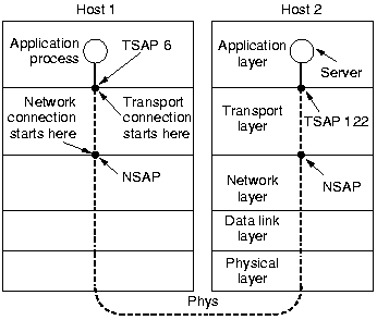 Transport layer addresses are called TSAP (Transport Service Access Point). In Internet, they consists of an (IP address, local port) pair, in ATM of an (AAL, SAP) pair. An IP address is an example of a NSAP. How does the user process on host 1 know that the address of the server, e.g. the time-of-day server, is attached to TSAP 122? One possibility is, that it has always been there and every one knows it. This might work for a small number of key services that never change, but, in general, user processes often want to talk to other user processes that only exist for a short time and do not have a TSAP that is known in advance. Furthermore, if there are potentially many server processes, most of which are rarely used, it is wasteful to have each of them active and listening to a stable TSAP all day long. |
