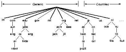 The Internet is divided into several top-level domains, generic (com, edu, gov, int, mil, net) and countries (us, nl, etc. according ISO 3166). Each domain is named by the path upward from it to the unnamed root: cs.kun.nl. Domain names are case insensitive, each component can be up to 63 characters and the total length may not exceed 255 characters.
