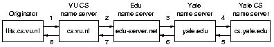 Suppose the resolver on flits.cs.vu.nl wants to know the IP address of the host linda.cs.yale.edu. It sends an UDP query to the local name server cs.vu.nl. If that has no (cached) information about it, it sends a packet to the top-level name server for edu, edu-server.net, which it has in its database. This forwards the request to yale.edu as it knows the address of all its children. There the request is forwarded to cs.yale.edu, which knows the address of linda.cs.yale.edu. The resulting resource record then goes back the chain. The local name server cs.vu.nl caches the result for a certain amount of time. However this information is not authoritative, since changes made at cs.yale.edu will not be propagated to all the caches in the world.