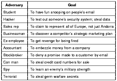 Network security problems can be divided roughly into four intertwined areas: secrecy, authentication, nonrepudiation and integrity. Secrecy has to do with keeping information out of the hands of unauthorized users. Authentication deals with determining whom you are talking to before revealing sensitive information. Nonrepudiation deals with signatures: how do you prove that a customer really placed an electronic order for 10000 pieces at $10 per piece when he later claims the price was $8? Integrity deals with knowing that the received message was not modified in transit.