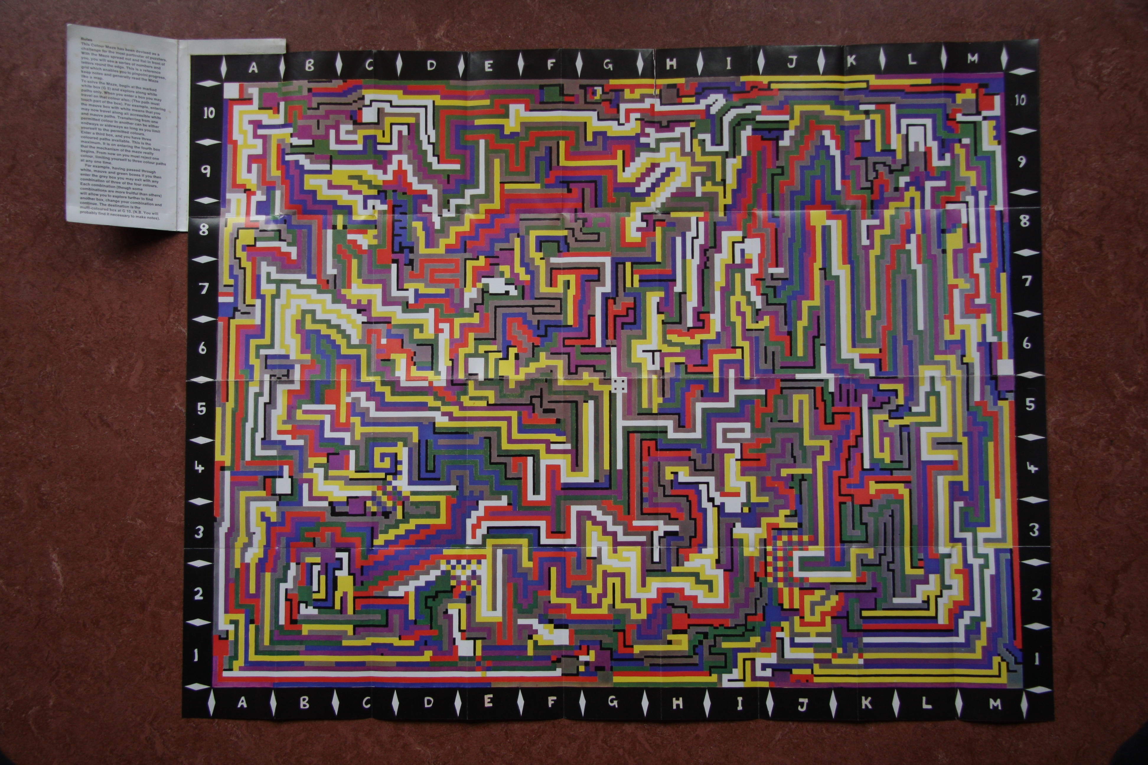 For example, having passed throught white, mauve and green boxes if you then enter the grey box you may exit with any combination of three of the four colours. Each combination (though some combinations are more fruitful than others) will allow you to explore further to find another box, change your combination and continue. The destination is the multi-coloured box at G 10. (N.B. You will probably find it necessary to make notes).